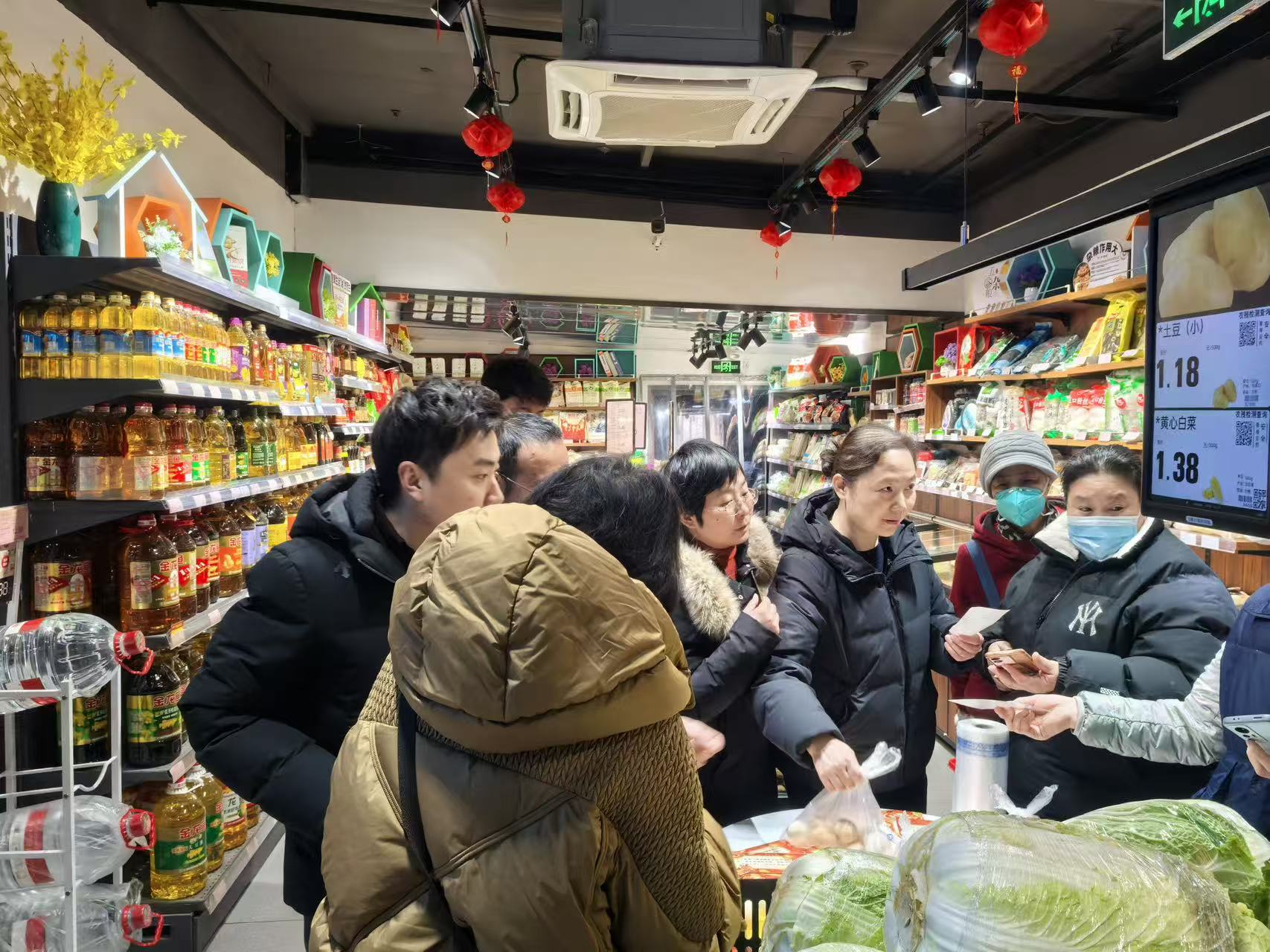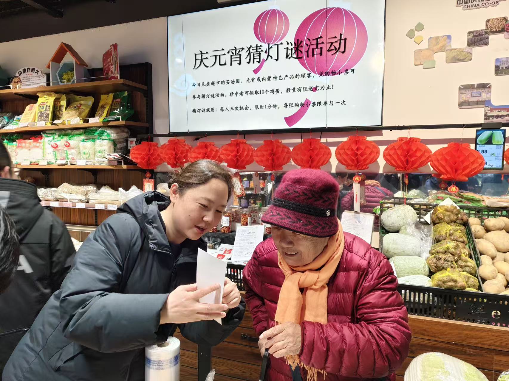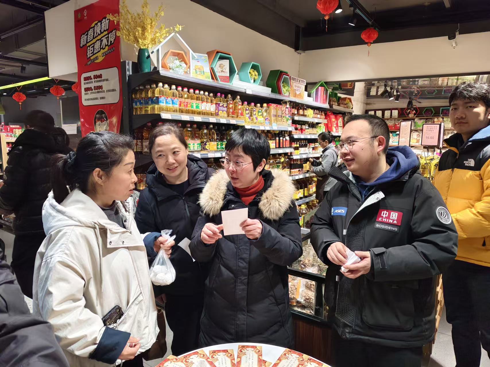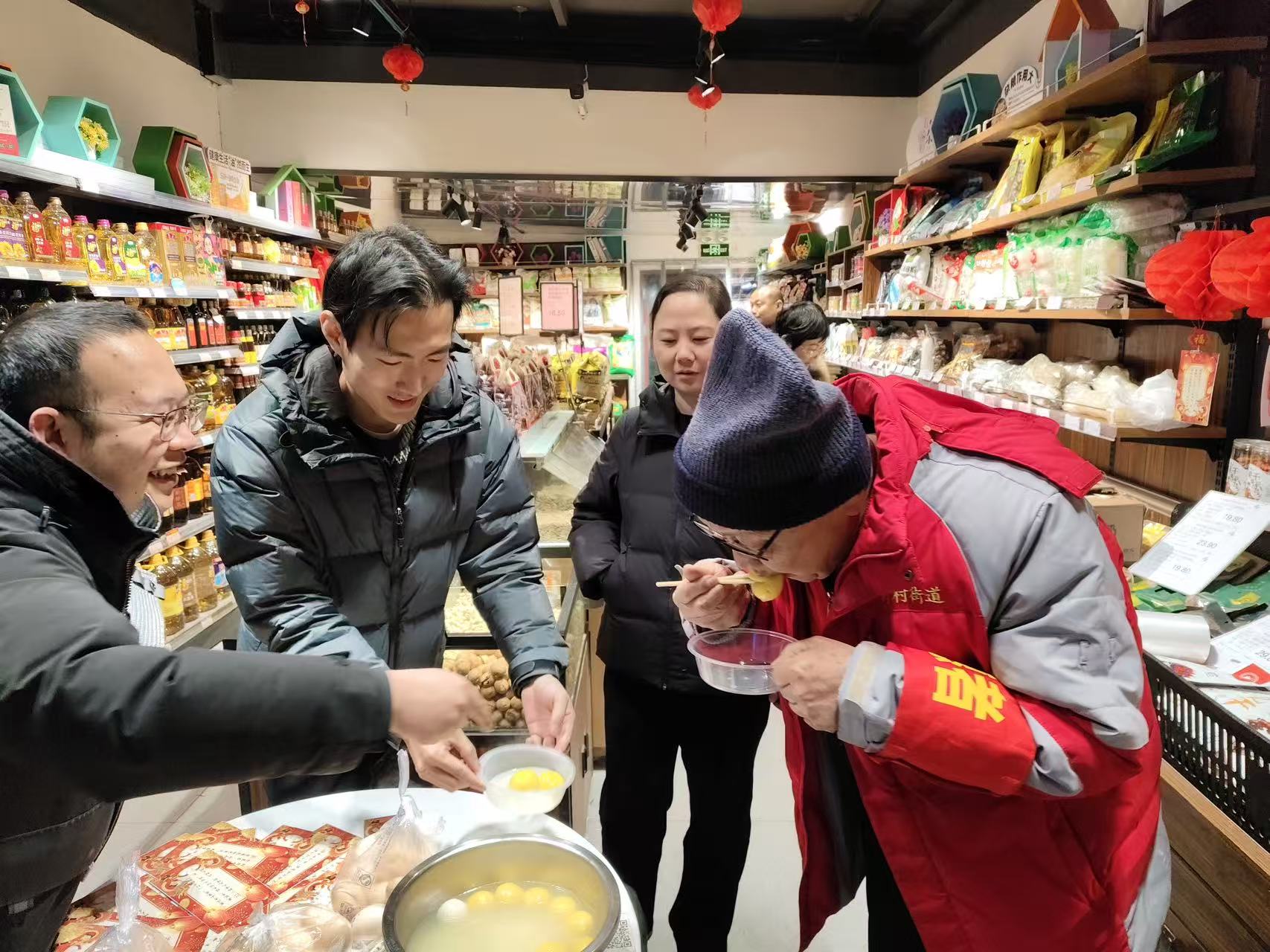 活动当天,汤圆试吃、猜灯谜有奖竞猜等群众喜闻乐见的互动环节同步开展,吸引百余名周边居民及过往群众踊跃参与,现场人流量较平日显著提升。党支部党员主动靠前,化身志愿者,积极参与现场引导、产品推介等服务工作,超市内人头攒动、热闹非凡,洋溢着温馨祥和的节日气息。